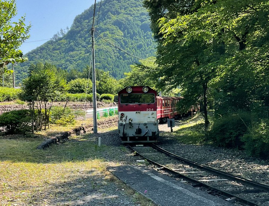 千頭駅から赤いトロッコ列車で大井川の流れに沿って澤間駅へ。